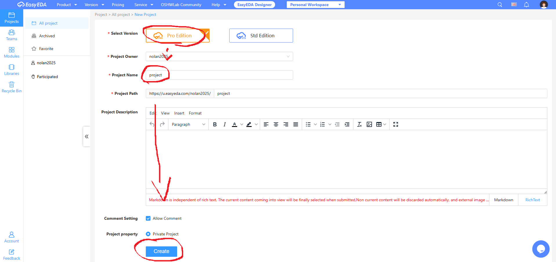 Creating a project;